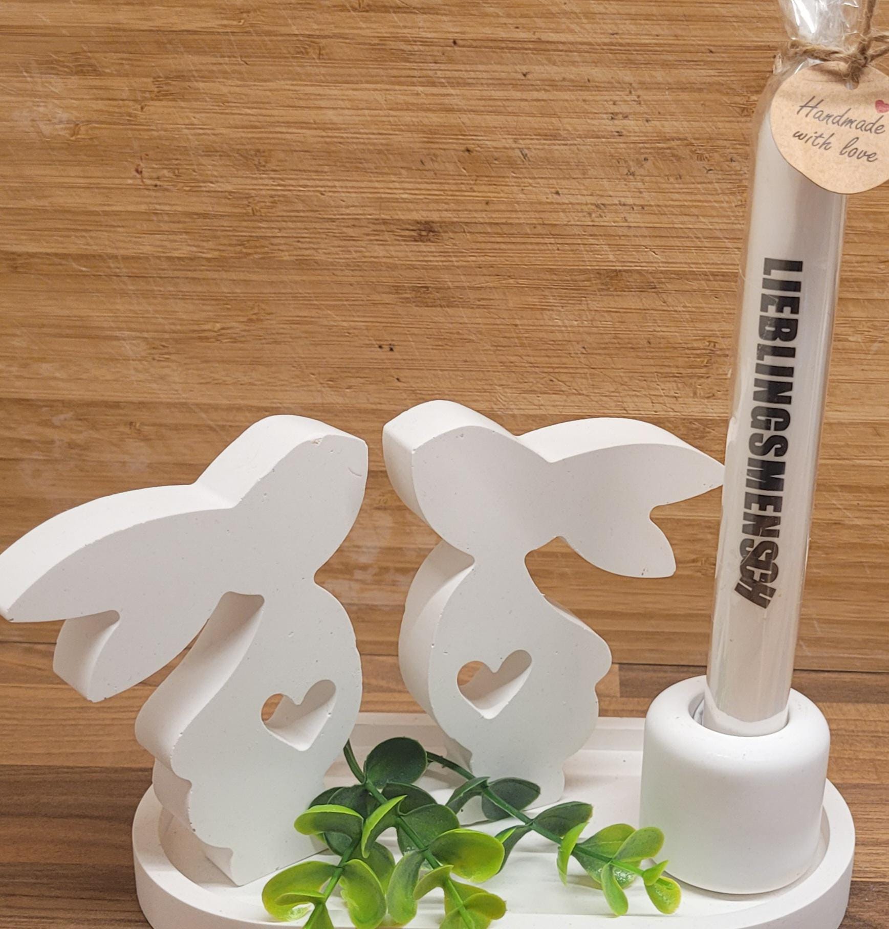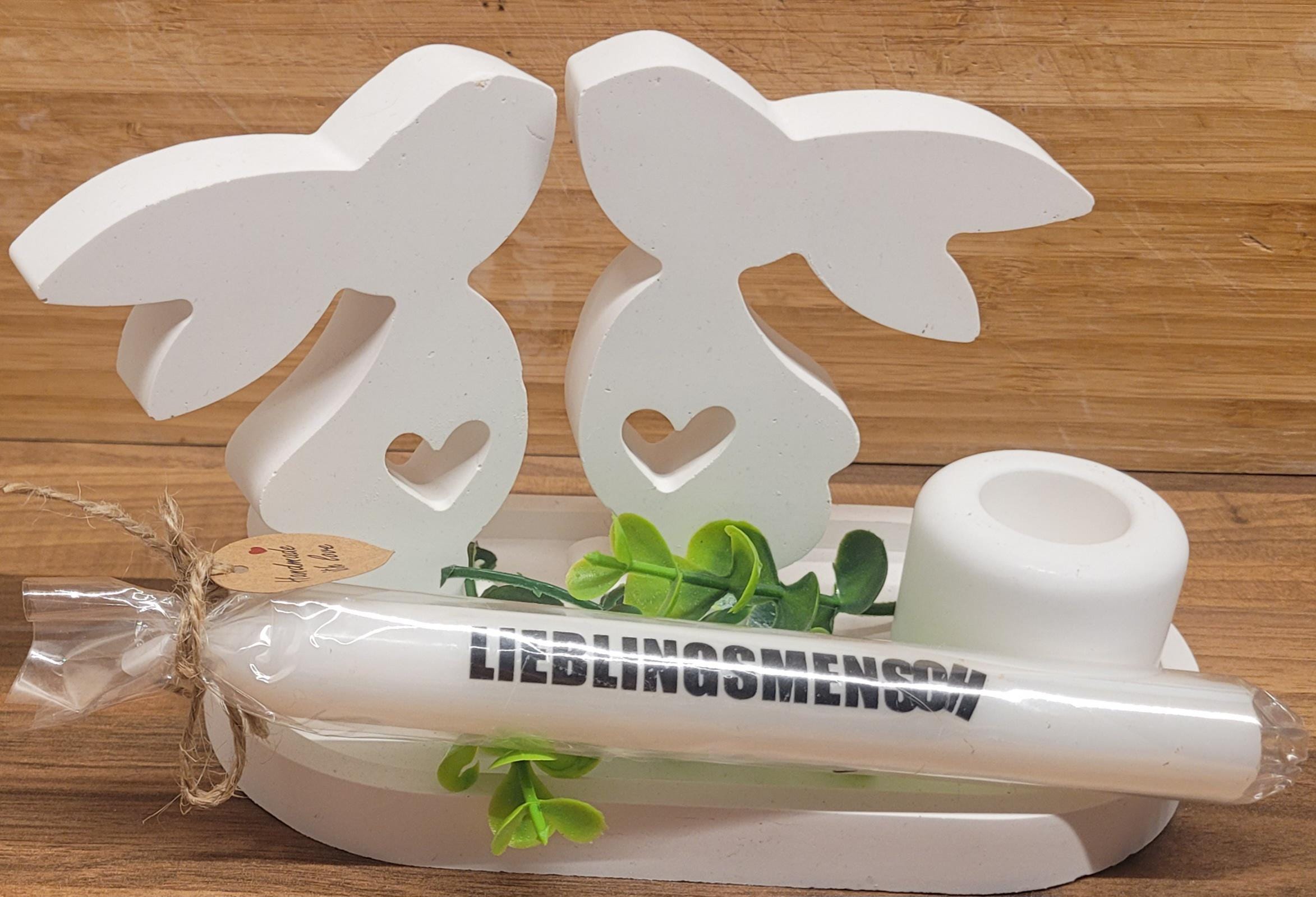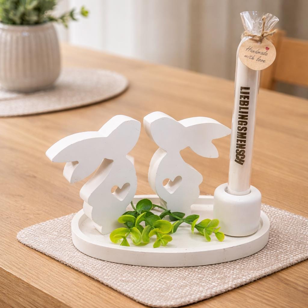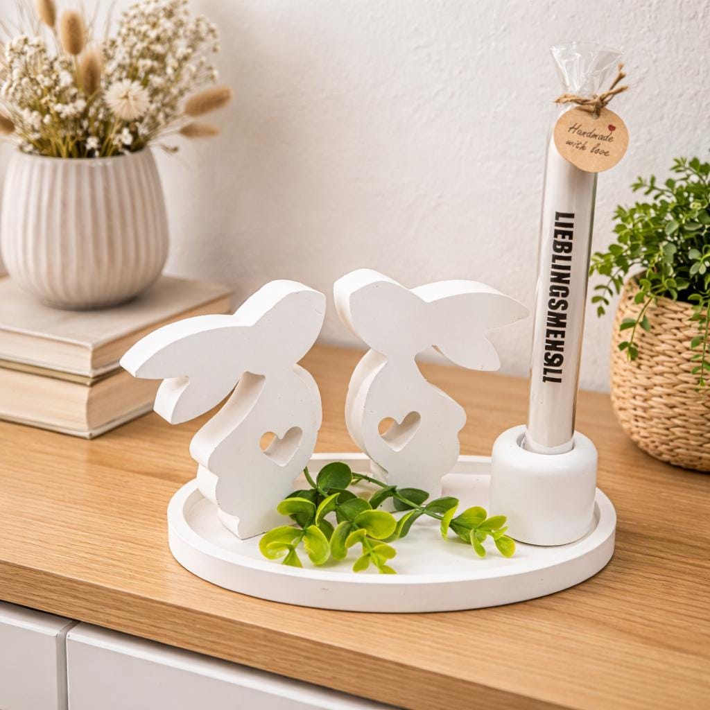 Enchanting Easter decoration in Scandinavian style – hand-poured white rayon tray with a pair of bunnies and a candle – gift idea for women
