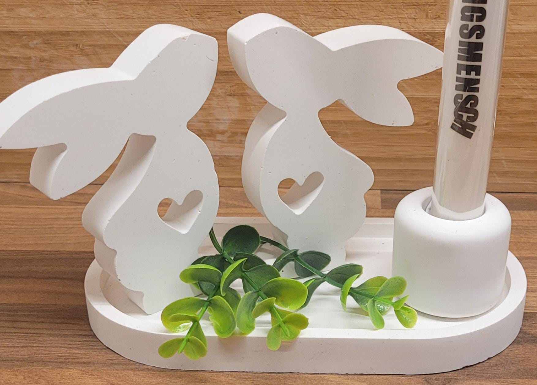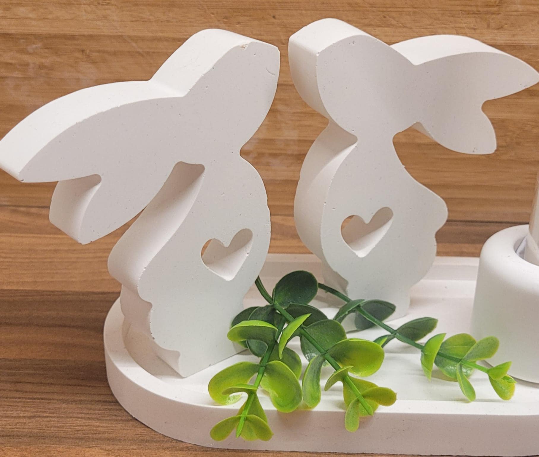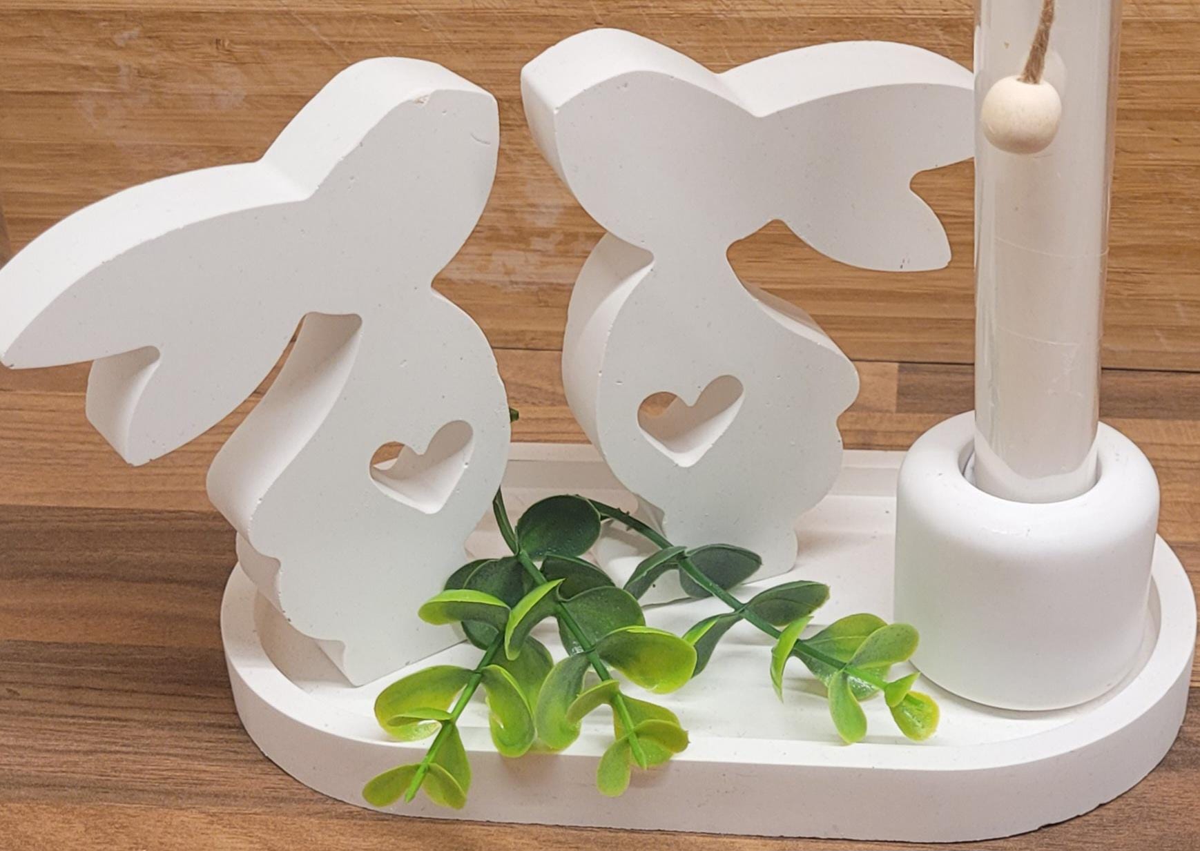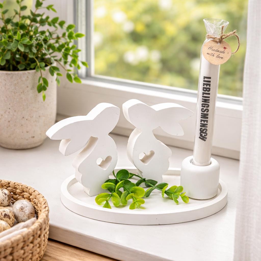 Enchanting Easter decoration in Scandinavian style – hand-poured white rayon tray with a pair of bunnies and a candle – gift idea for women