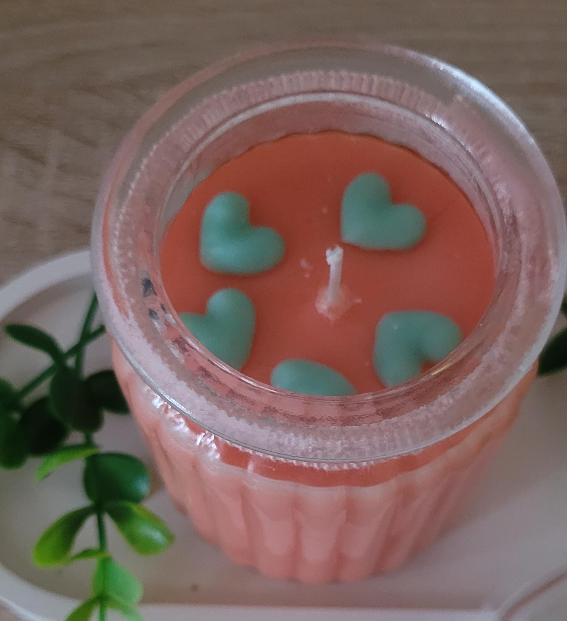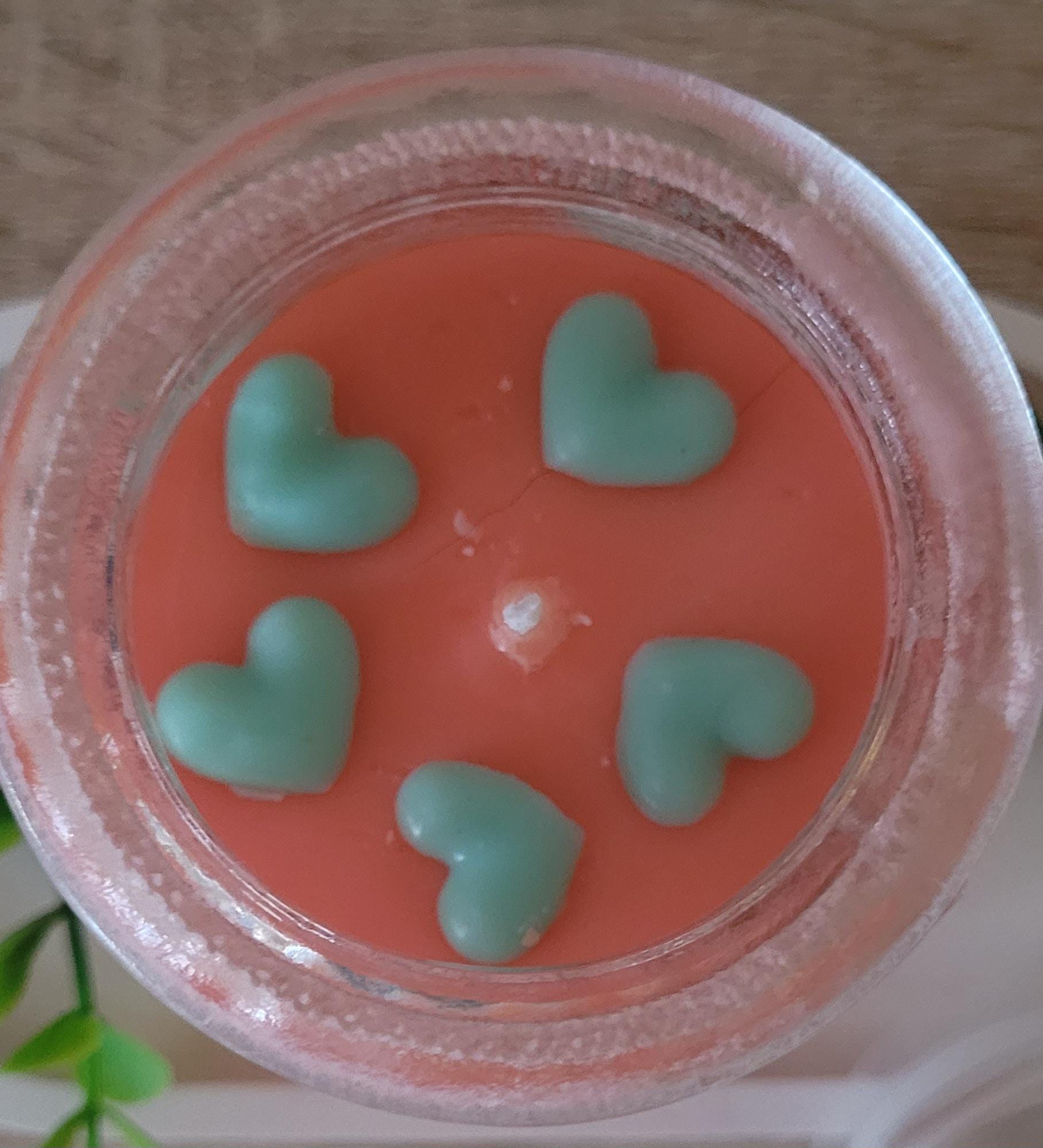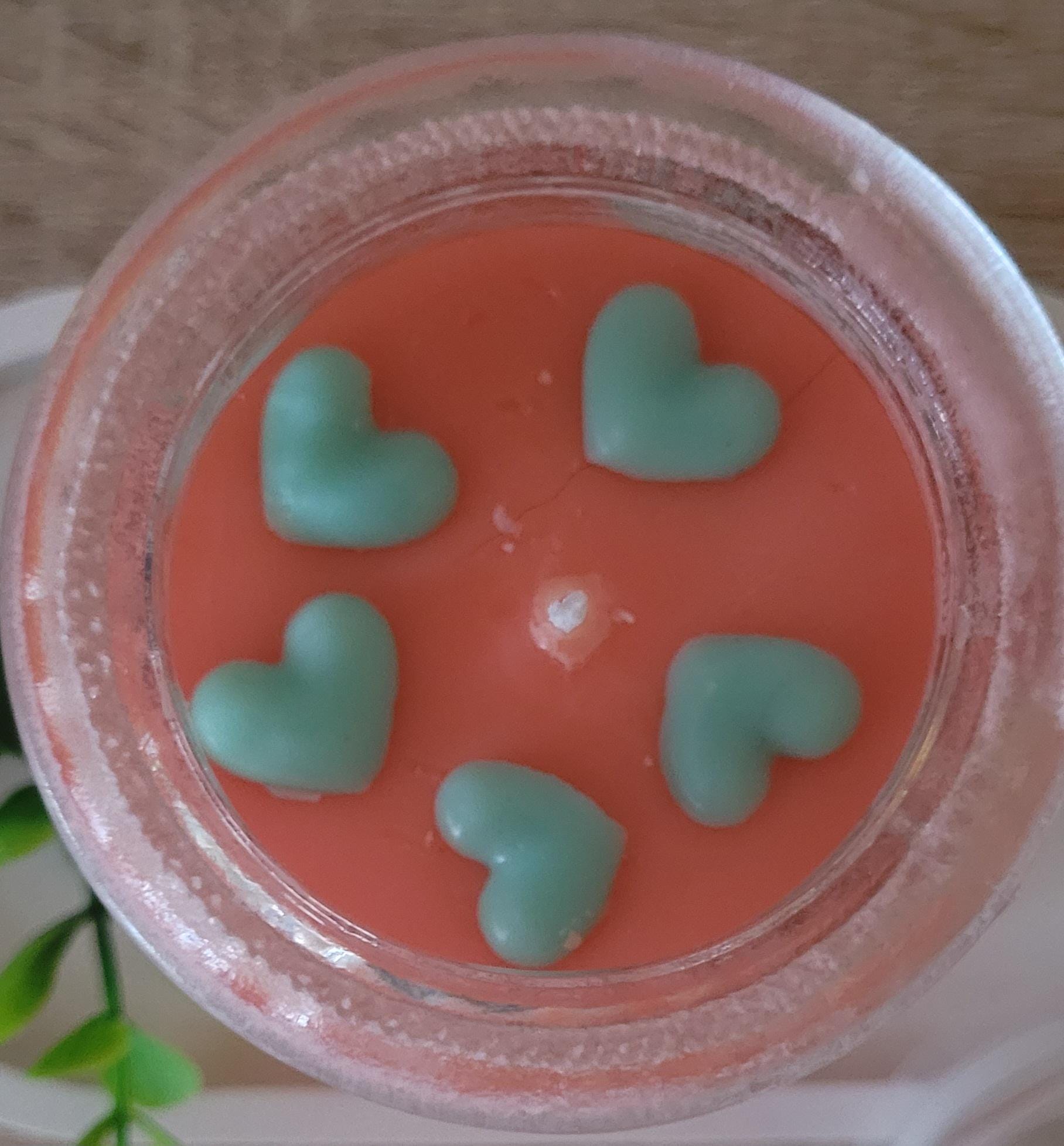 Kleine grüne Wachsherzen verzieren die Oberfläche und verleihen der Kerze einen einzigartigen, verspielten Charakter.